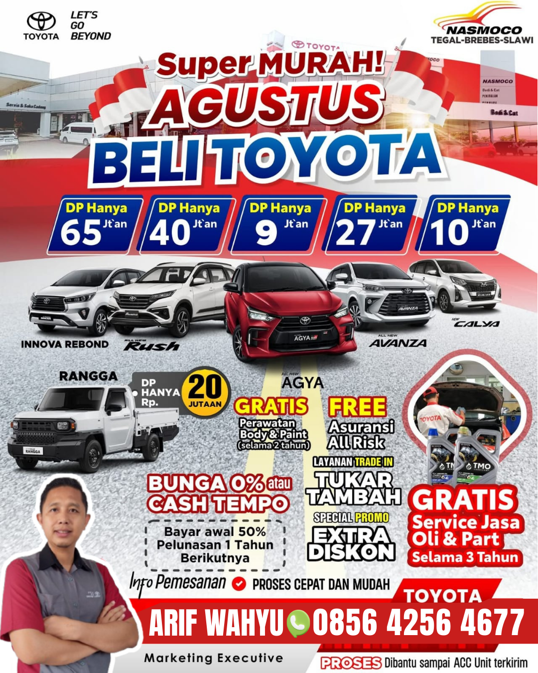 PROMO HUT NASMOCO TOYOTA KE-64 BONUS EMAS DAN UMROHSaat yang tepat memiliki mobil toyota impian keluarga anda. Dengan promo Dp Rendah dan angsuran